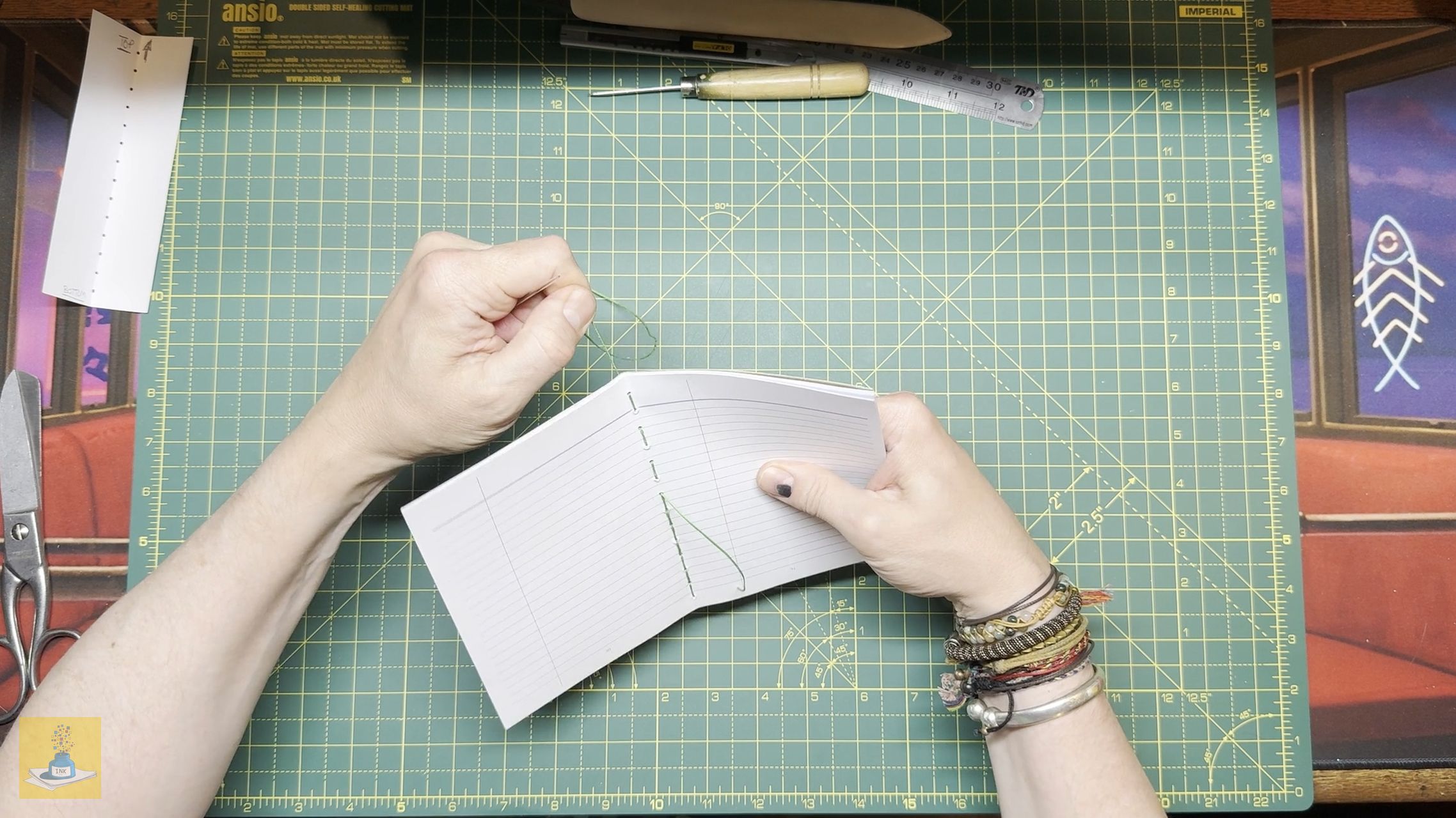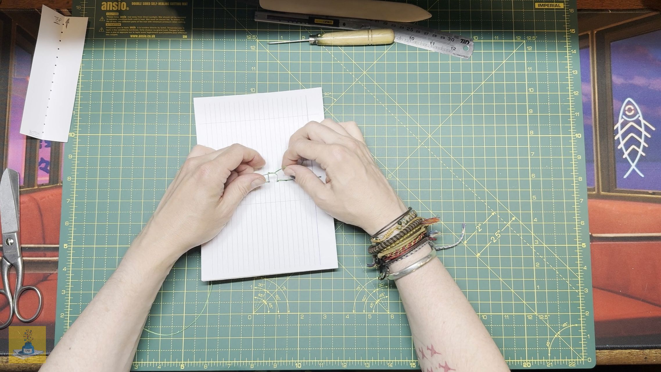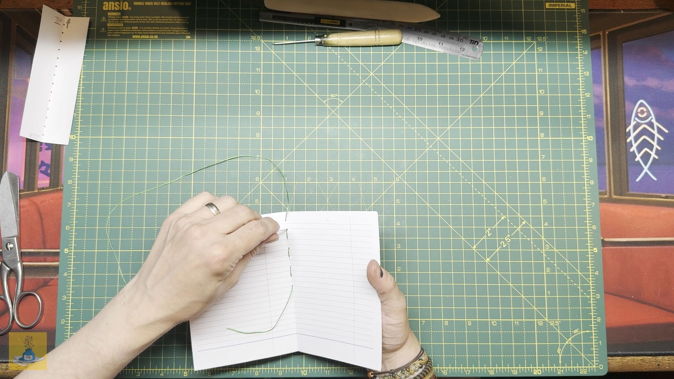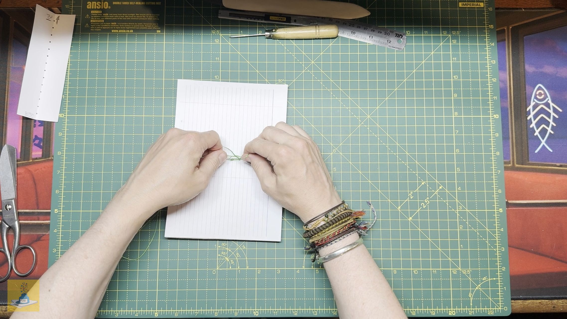 - If you don’t have a punching cradle, you can use the template I’ve created, aligning to the top edge of the paper on the spine. With the paper slightly closed and the spine on the edge of a table, use your awl or needle to poke holes from the inside.