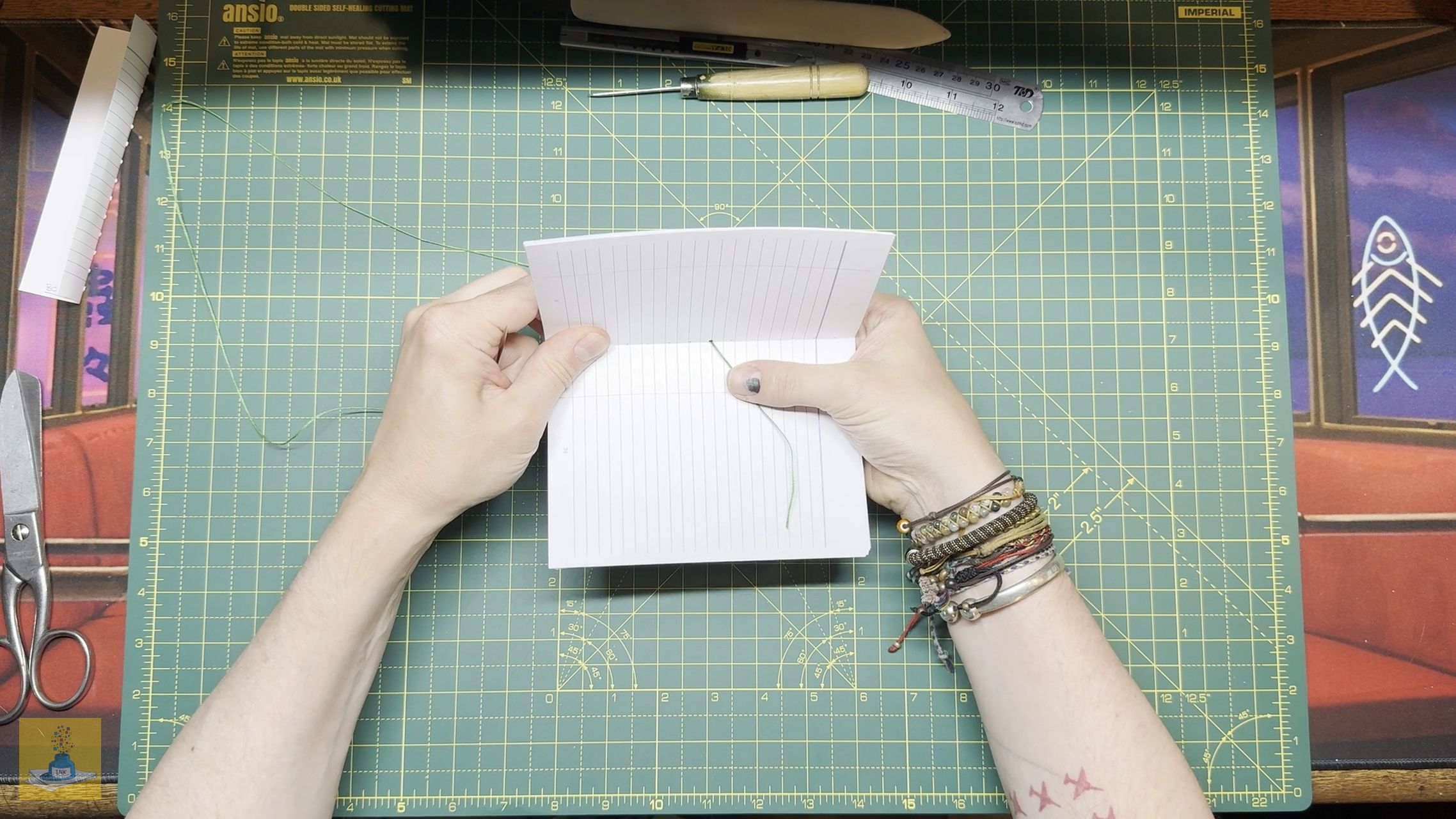 - When at the bottom hole, go back into the next hole up, making sure you don’t pierce the thread that’s already there. Continue this pattern all the way to the very top of the notebook.