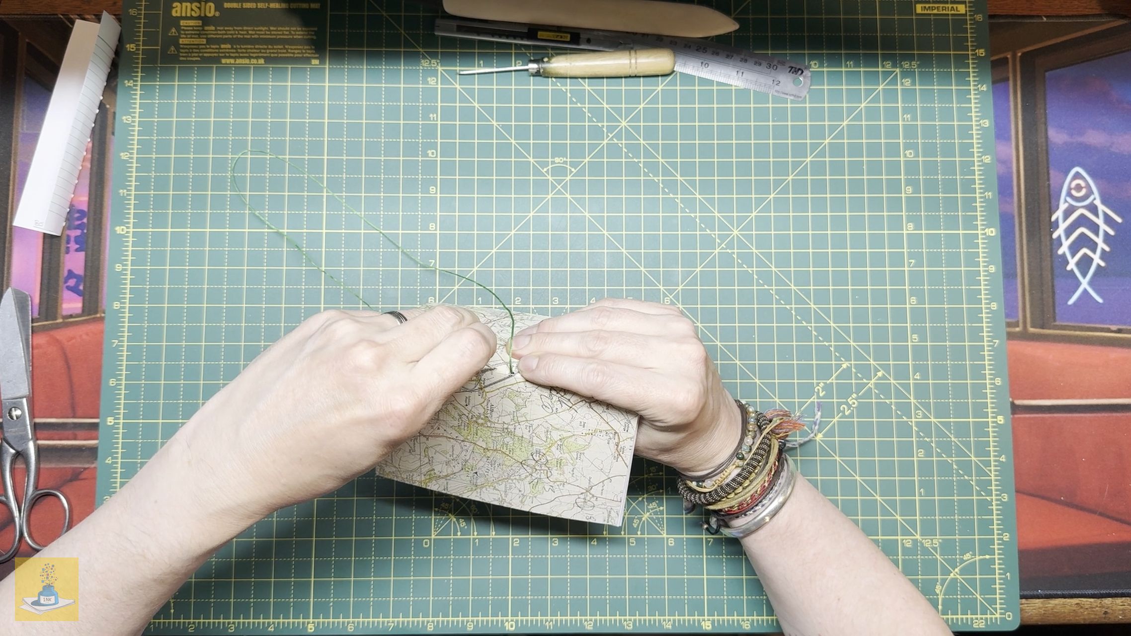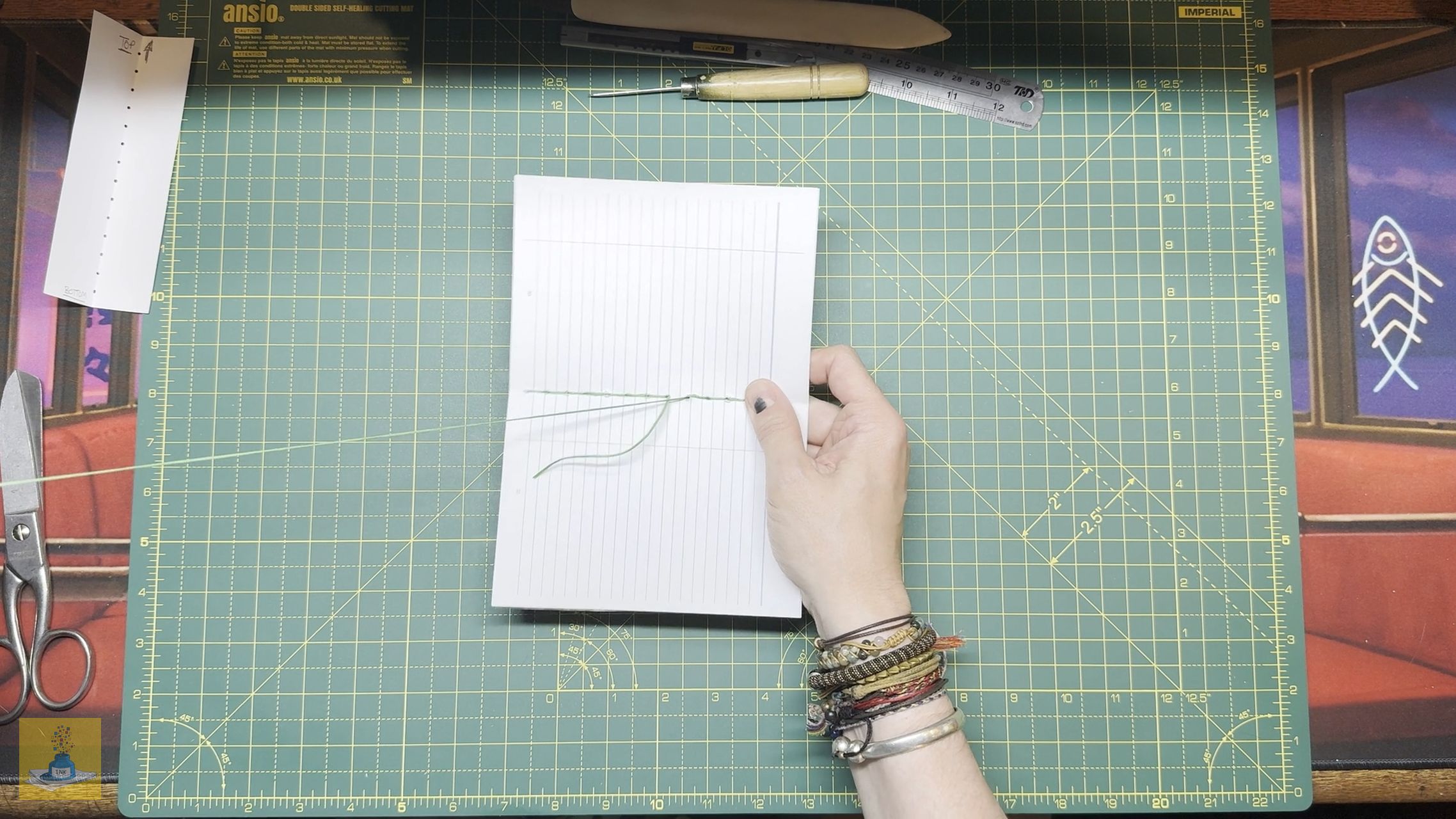 - Go in the next hole down and out the next, and repeat until you come out of the very bottom hole. Pull the thread taut as you go along, but not so tight that it causes damage to the paper.