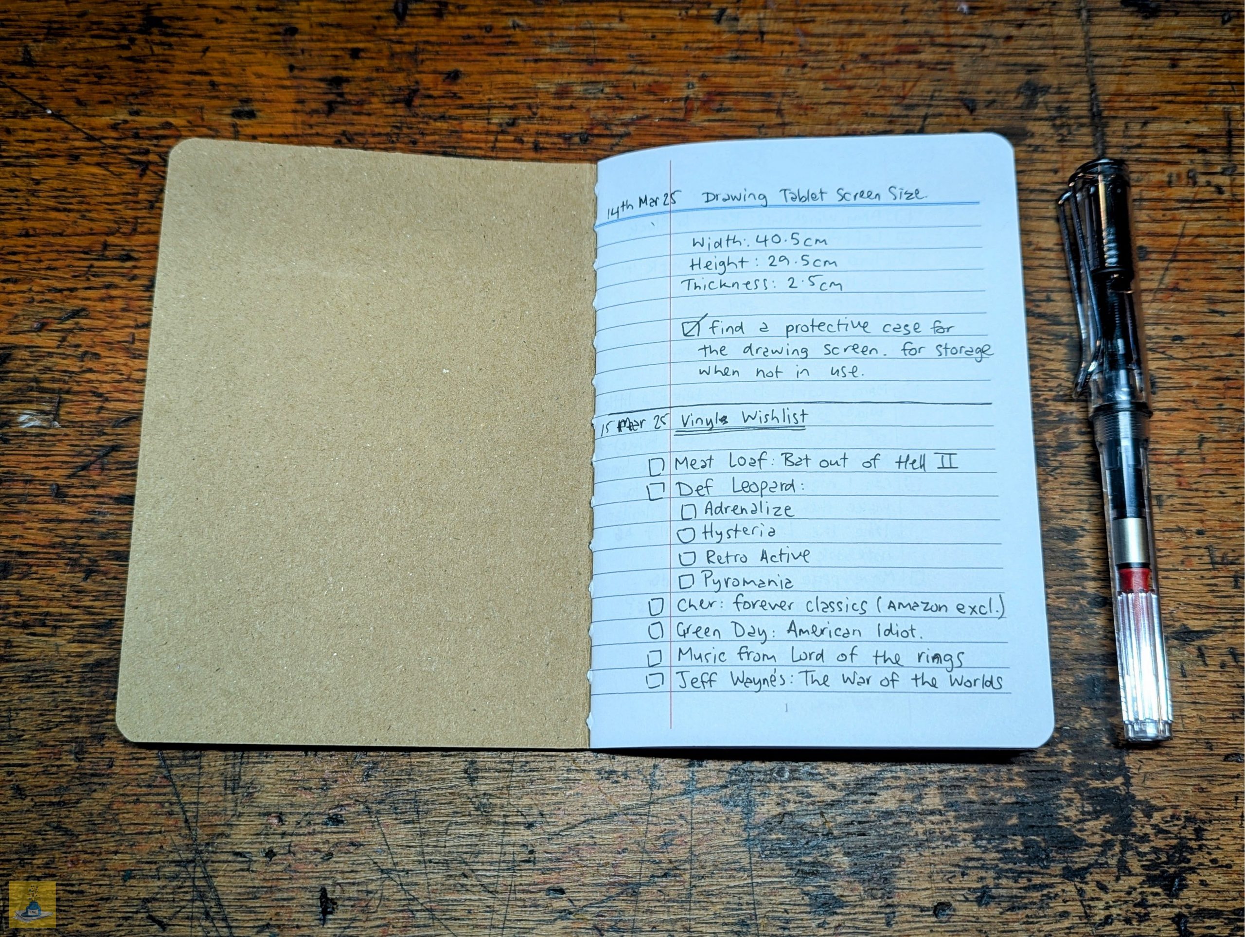 I’ll even use it for making a list of some sort, for example, I need a shopping list, or I have a list of vinyls (please don’t judge me from the photo shown below) I want to find and I’ll tick them off the list as I find them – a bit like a wishlist.  And lists of tasks I need to complete that day (or even over time).  I’ll use it for anything I need to remember!