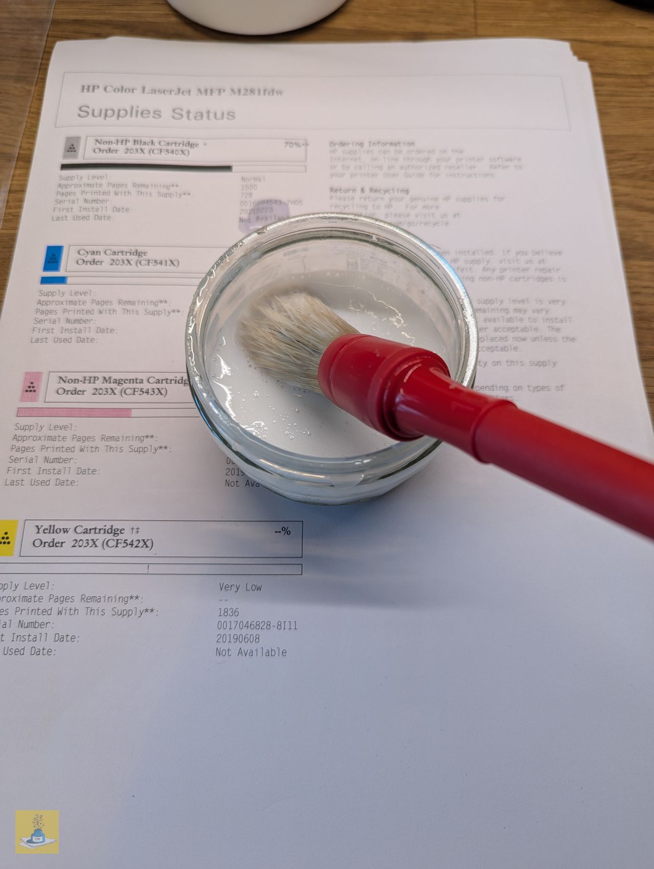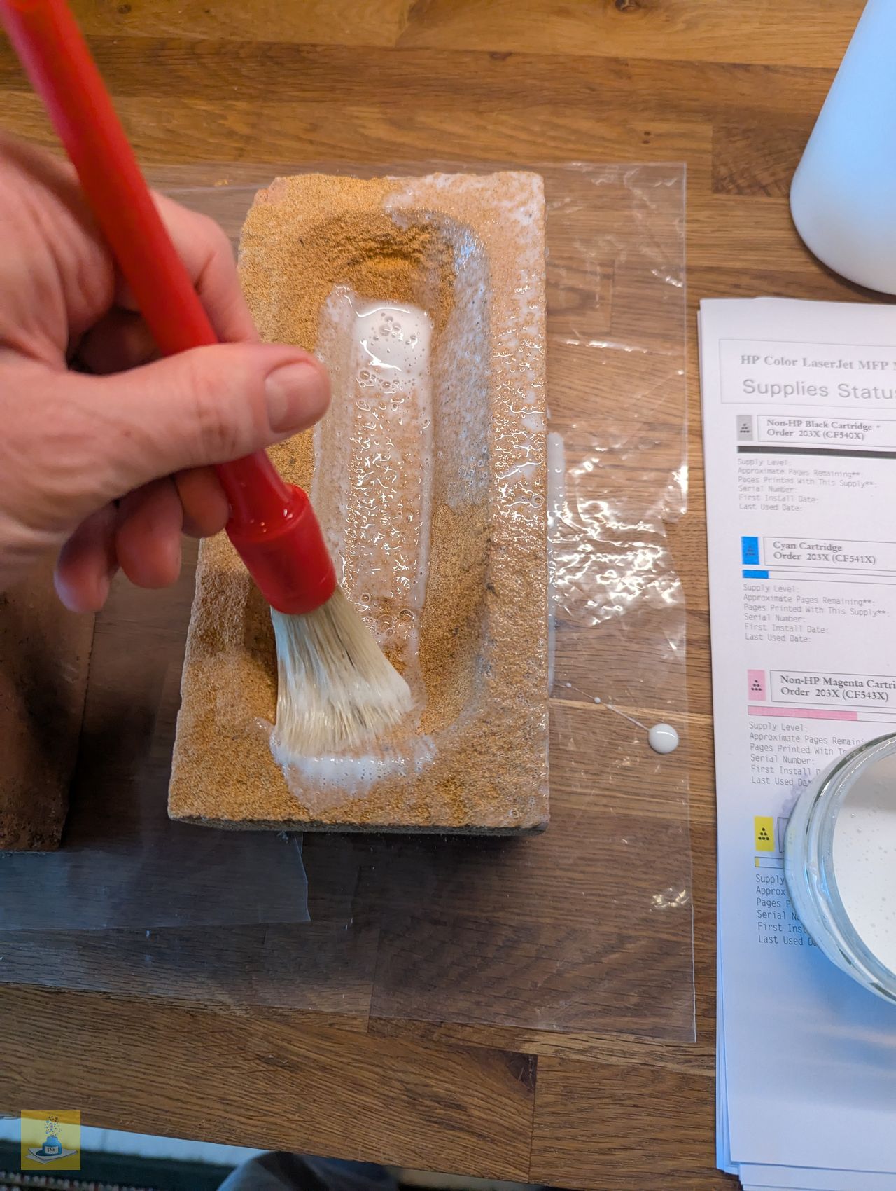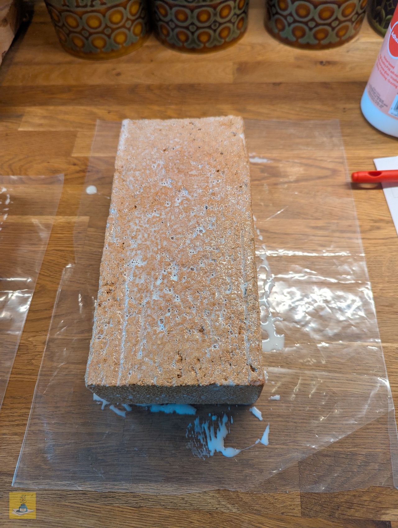 Another fantastic tip I learned from a Youtuber called Four Keys Book Arts was to brush on a mixture of water and PVA glue all over the brick. This creates a sealant, which should help prevent further dust from breaking away and hopefully prolong the time before re-wrapping becomes necessary.