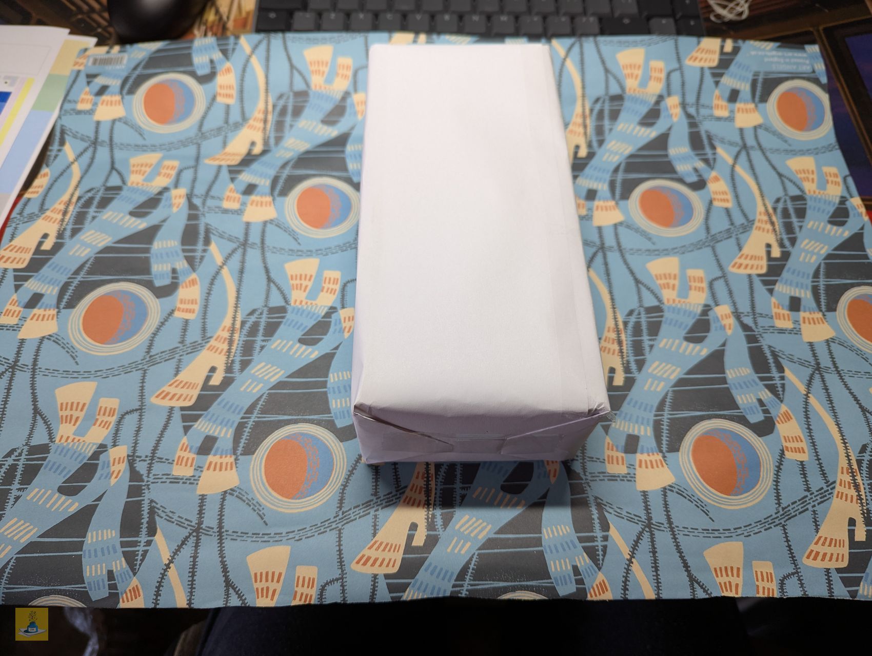 To be on the safe side, I decided to wrap the bricks in a plain piece of paper first. My thinking was that the brick’s roughness might snag or tear the more decorative outer layer directly. So, a sheet of plain A3 paper was my initial choice.
